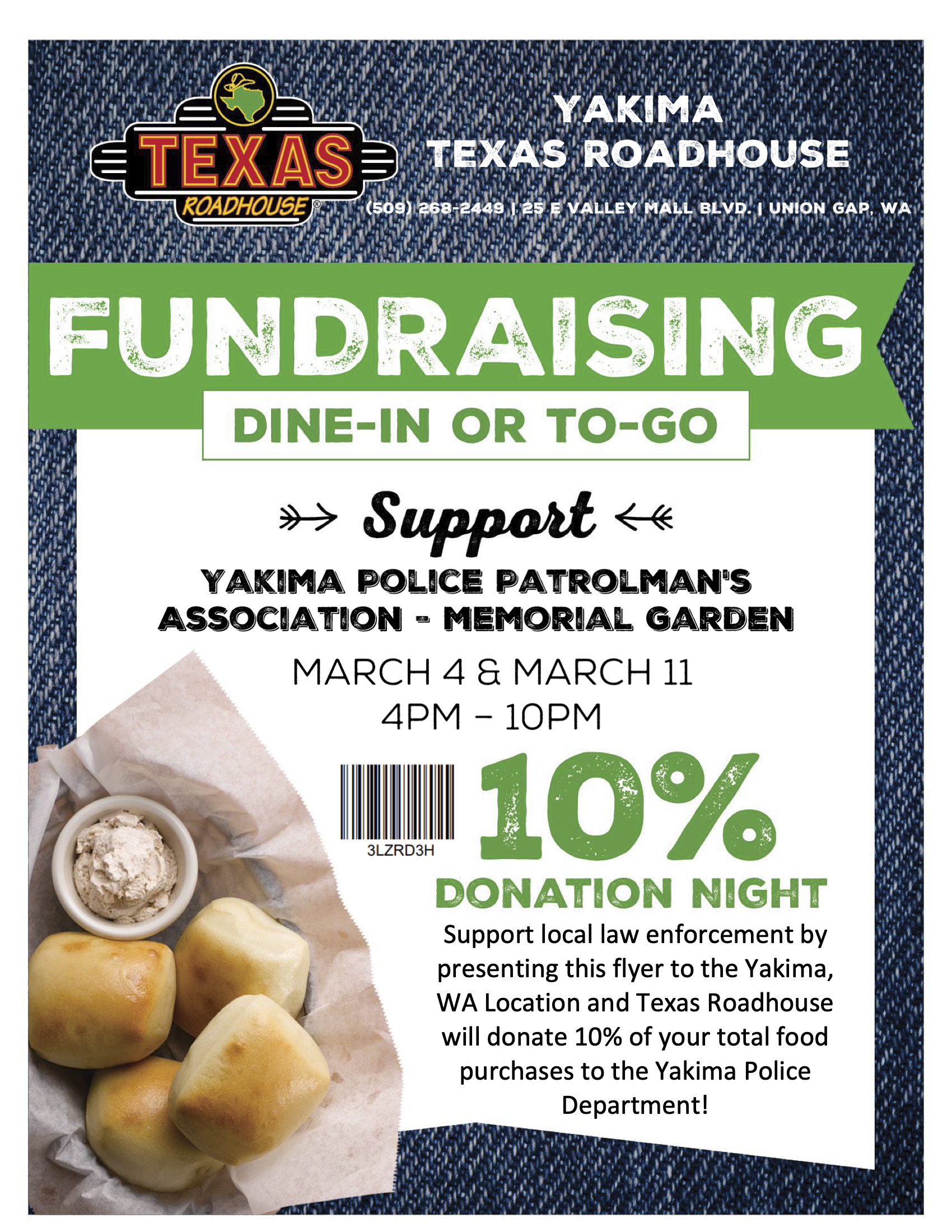 Support local law enforcement by presenting this flyer to the Yakima, WA location and Texas Roadhouse will donate 10% of your total food purchases to the Yakima Police Department!